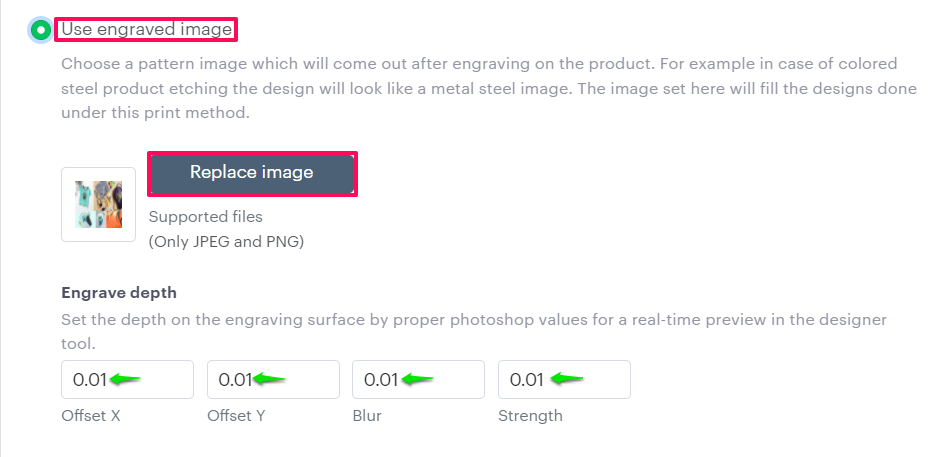 – Selecting this option will fill the custom design that is added to the product with the image that is defined in this section. To show the real-time preview of engraving, you can set the values for Offset, Blur, and Strength.