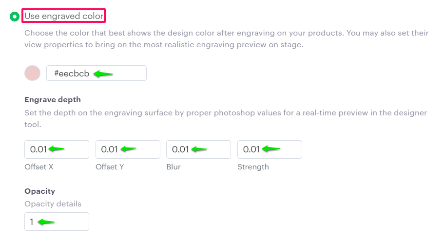 – Enabling this option will allow you to select the color from the color picker/manually enter the hex code of the color to set the engraving preview in the designer tool. To show the real-time preview of engraving, you can set the values for Offset, Blur, Strength, and Opacity.