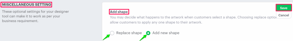 4. The Print method setting page will appear, and scroll down to find Miscellaneous Settings. Under the Add shape section, select your desired option.