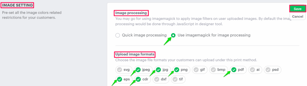 4. The print method setting page will appear. Scroll down to find the Image setting. Under Image Processing, enable the radio button of Use Imagemagick for image processing.