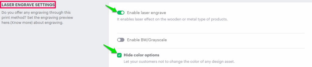 4. The Print method setting page will appear. Scroll down to find Laser Engrave Settings, toggle the button of Enable laser engrave, and enable the checkbox of Hide color options.