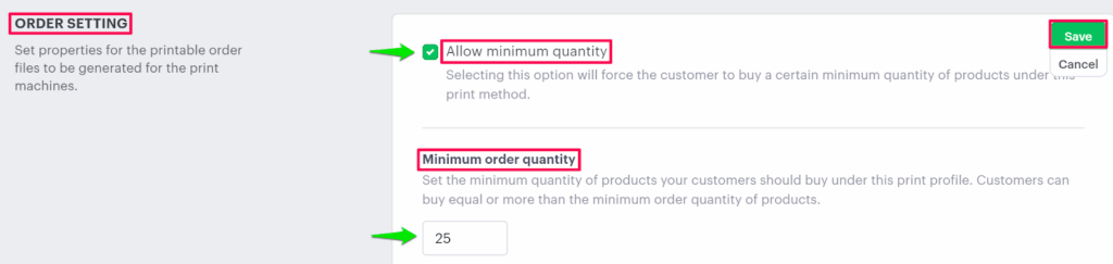 5. Move to the right and select the checkbox of Allow minimum quantity. Under Minimum order quantity, enter your desired minimum value inside the textbox.