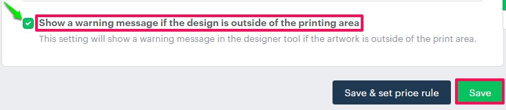 ► In the designer tool, a warning message will appear when the customer moves the design outside the decoration area.