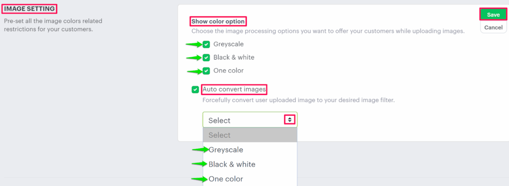 4. The print method setting page will appear, and scroll down to find Image Setting. Under the Show color option, select any color shade option for image processing.