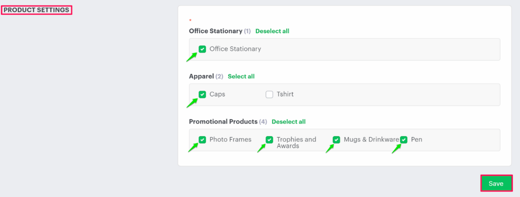 5. The product settings page appears. In the Product settings section, select the checkbox of your desired subcategories of product, which are under the product category.