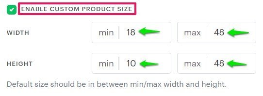► The Custom Product Size option allows customers to modify product dimensions within a set minimum and maximum range.
