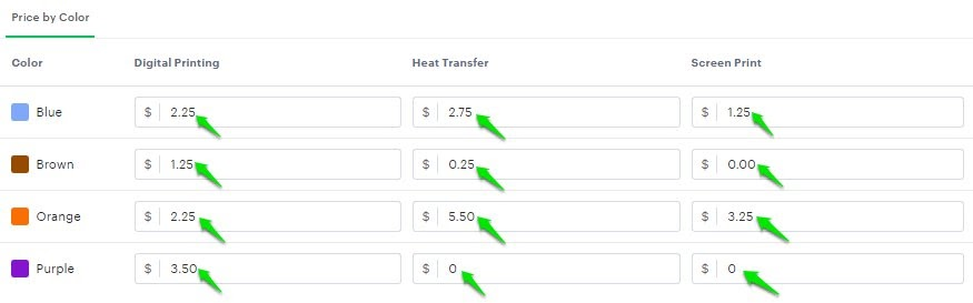 • Enter the additional cost for each desired product color variant under the respective print methods (e.g., Digital Printing, Heat Transfer, Screen Print, etc.).