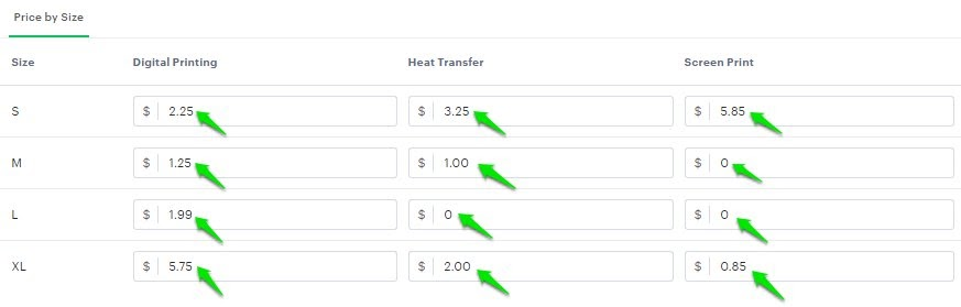 • Enter the additional cost for each desired product size variant under the respective print methods (e.g., Digital Printing, Heat Transfer, Screen Print, etc.).