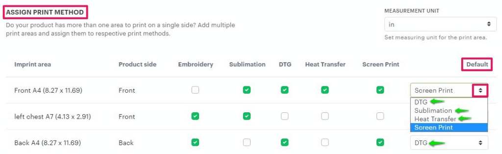 • Under the Default column, open the dropdown for each decoration area and select your preferred default printing method.