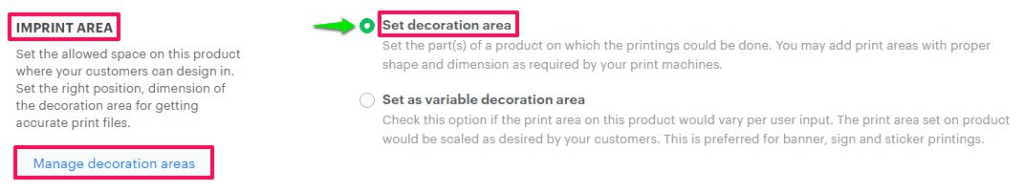 4. In the Imprint Area section, select Set Decoration Areas and click “Manage Decoration Areas.”